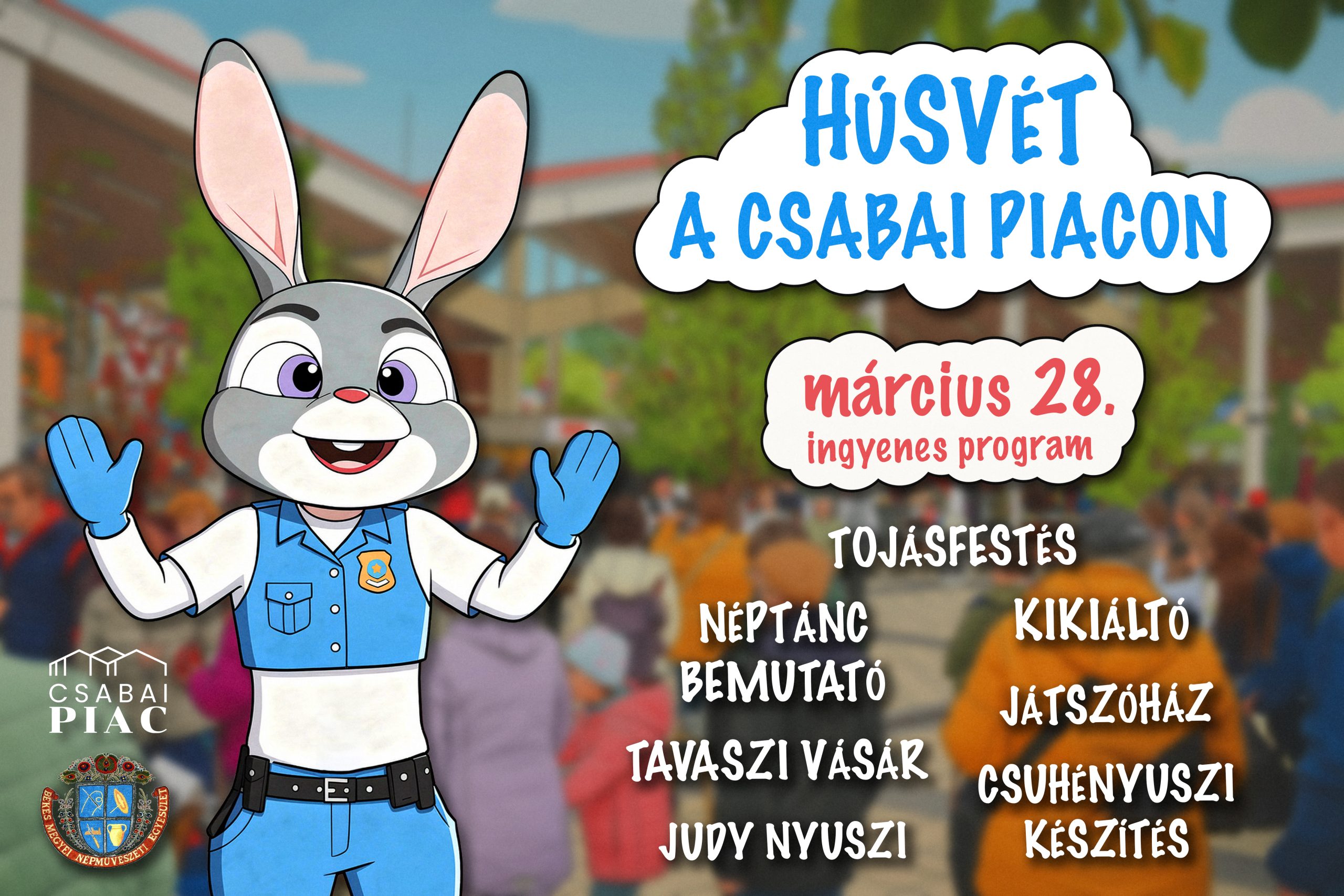 A jó hangulatról interaktív programok gondoskodnak: lesz kikiáltó, aki a vásári forgatag hangulatát idézi meg, valamint játszóház is várja a gyerekeket. Az esemény egyik különlegessége az életnagyságú judy nyuszi, amellyel a látogatók akár közös fotót is készíthetnek. A kreatív foglalkozások között szerepel csuhényuszi készítés is, amely a hagyományos kézművességet hozza közelebb a résztvevőkhöz. Emellett a néptánc is helyet kap a vásártéren.